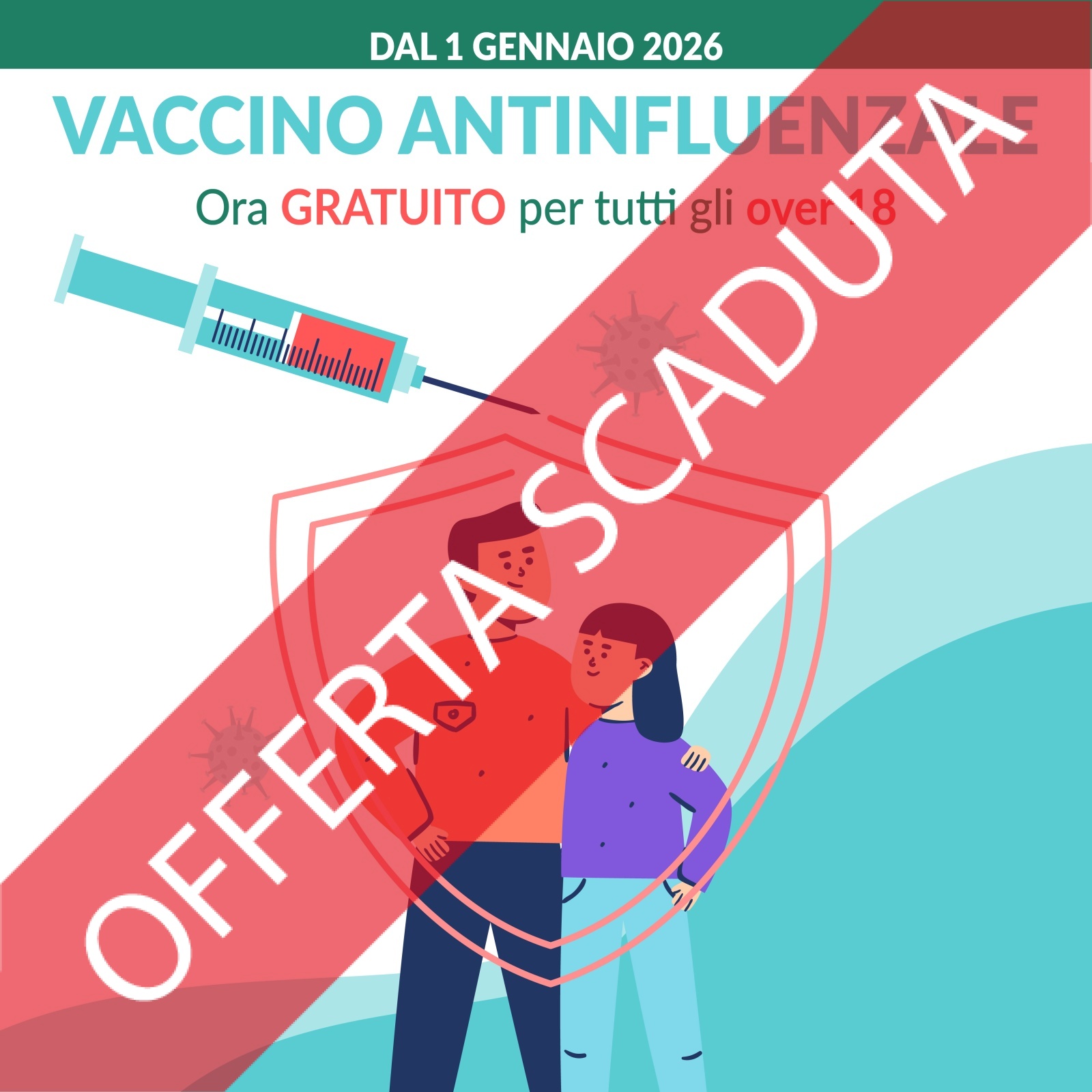 La tua salute è la nostra priorità. Dal 1° gennaio 2026, la campagna di vaccinazione antinfluenzale si amplia: il vaccino è ora completamente gratuito per tutti i cittadini di età superiore ai 18 anni.